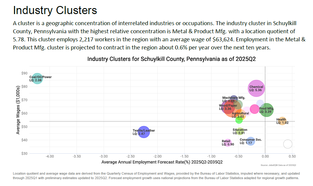 Highridge Business Park draws workers from a labor shed comprising Schuylkill and its neighboring counties (i.e., Berks, Carbon, Colombia, Dauphin, Lebanon, Luzerne, Montour, Northumberland).